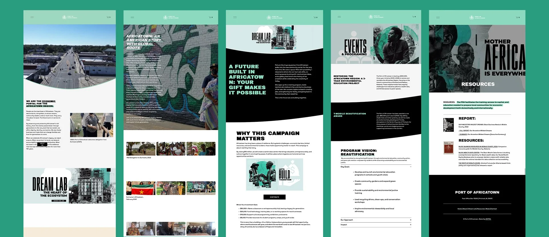Pictured above: a quick glance of the home page and dreamlab on Port Of Africatown's new website.